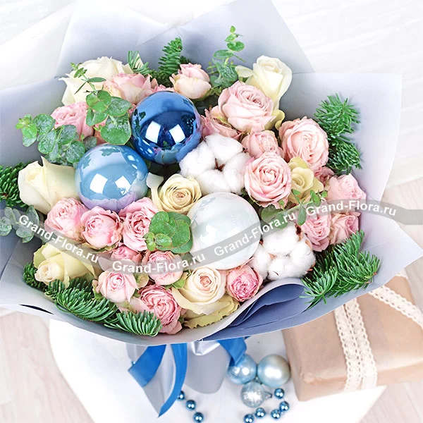 Новогодний букет с нобилисом, ёлочными игрушками, белыми и розовыми розами – это праздничное украшение, которое создаст волшебную атмосферу в вашем доме или станет незабываемым подарком для близких. Этот букет сочетает в себе классические зимние мотивы и современные тенденции флористики, превращаясь в настоящий шедевр.